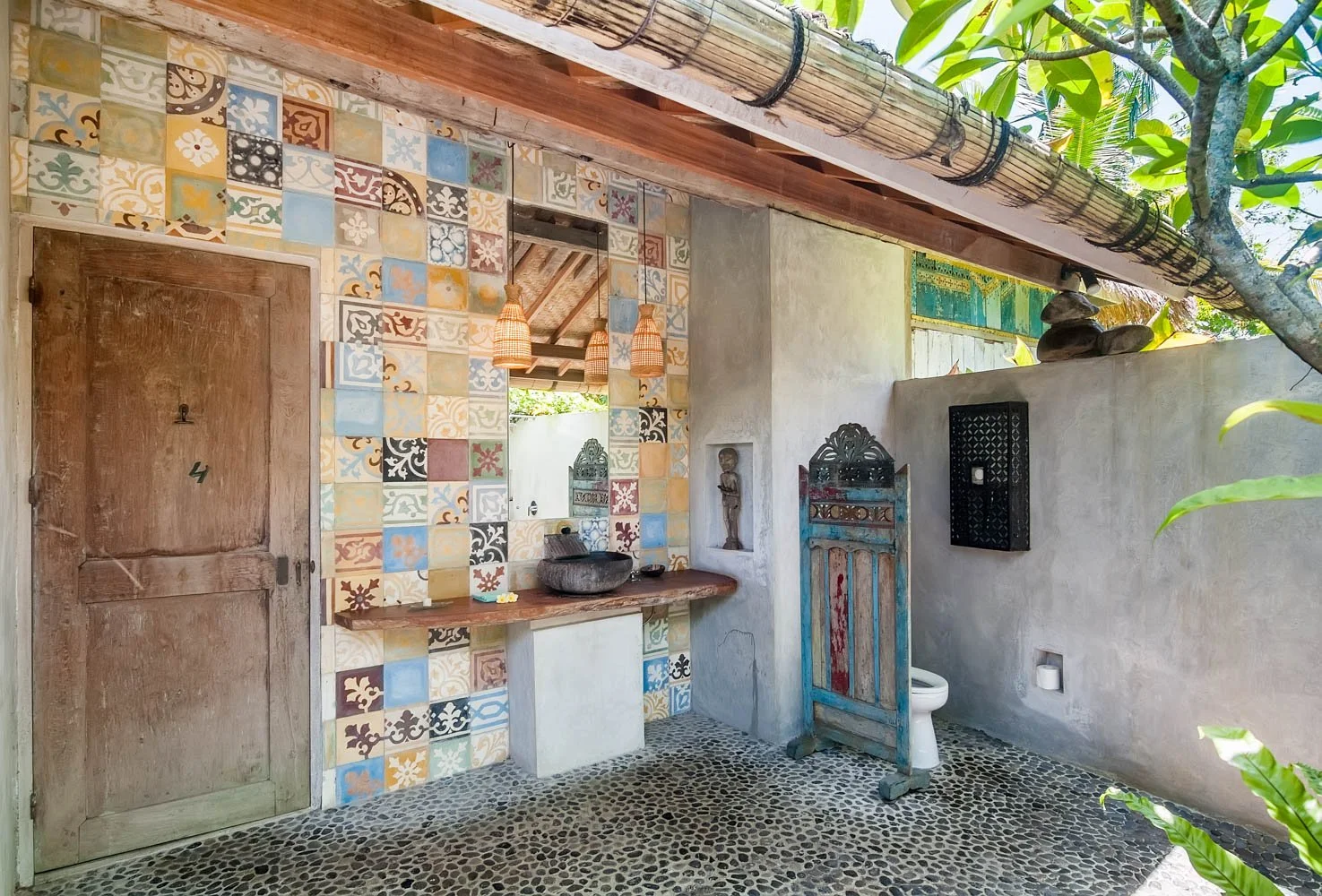 hand-hewn 100 + year old teak joglo, alang- alang grass roof, polished cement counter and sink, heritage cement tile floors.